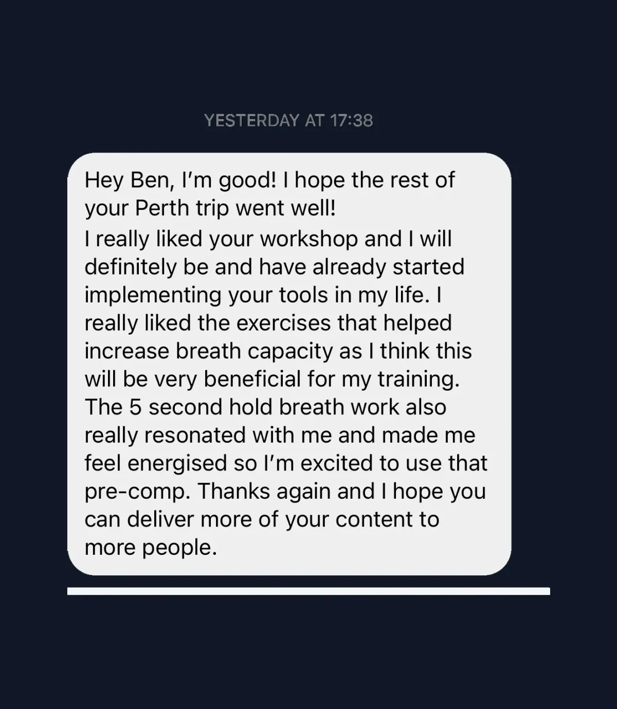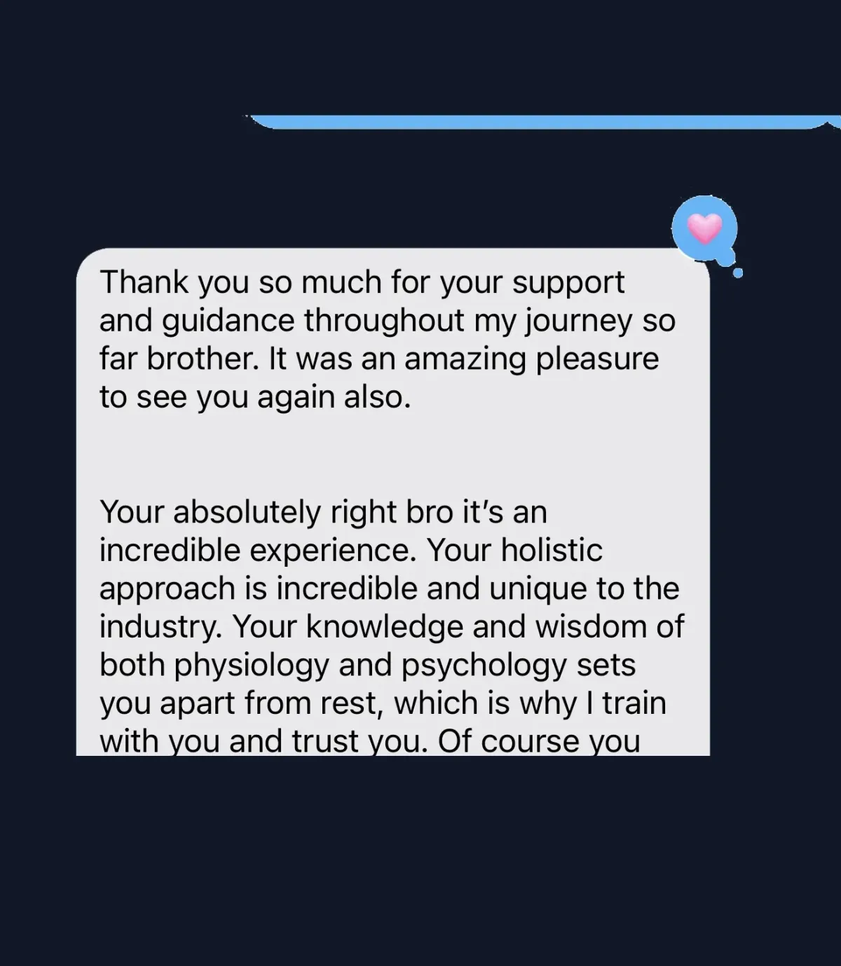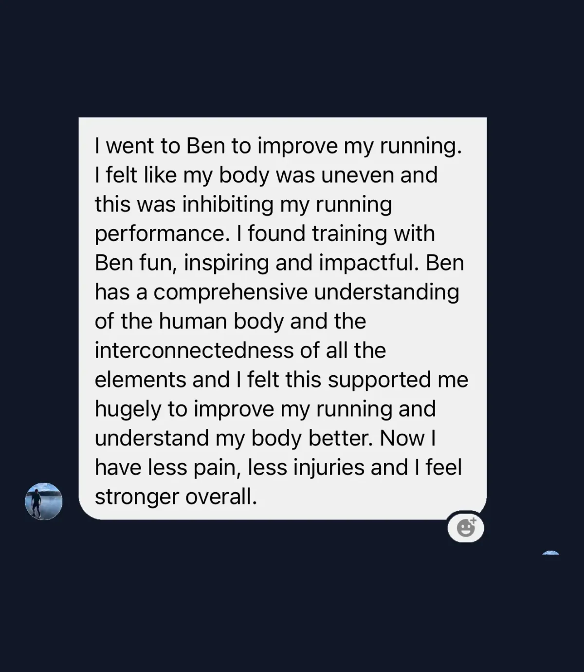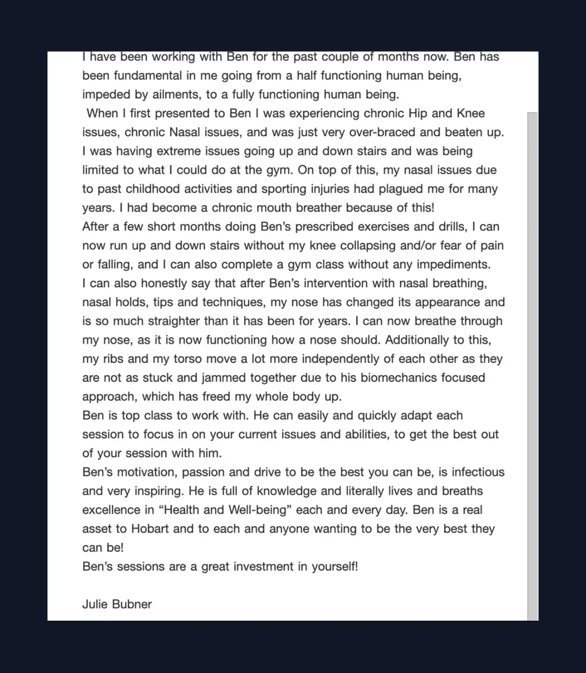 "Ben’s holistic approach is incredible and unique to the industry, helping me reach a level of success in my health, work & life I didn’t know I was capable of. His knowledge of both physiology and psychology sets him apart from the rest which is why I train with him and trust him."